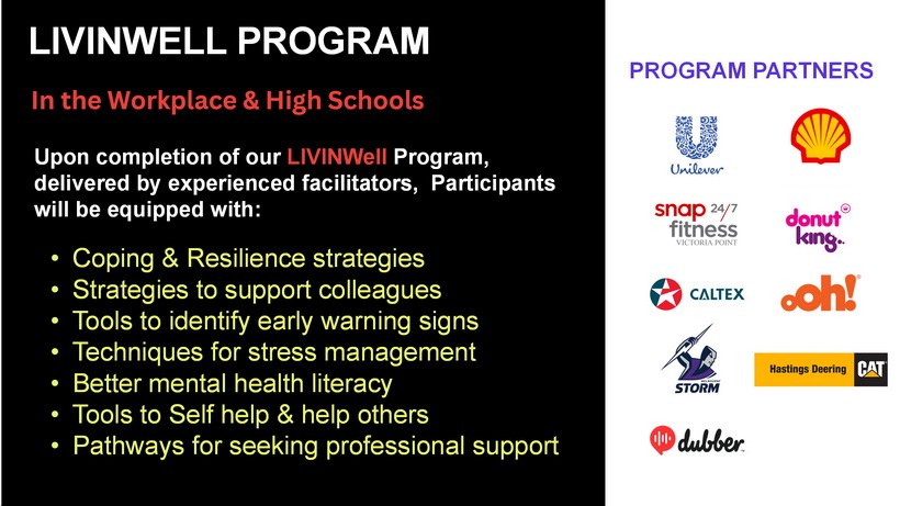 Bruno Santi delivered a presentation for LIVIN - a non-profit mental health organisation that was founded in 2013 by two people in memory of a friend who suffered from mental health issues in silence and committed suicide. LIVIN's mission is to empower people experiencing mental health issues to speak up because It Ain’t Weak To Speak®. LIVIN aims to be proactive in combating mental Illness, and encourages preventative action by seeking help before things become unmanageable. This is done through programs that educate, motivate and advocate. Statistics show that depression is the leading disability worldwide, and is most prevalent in the 15 - 44 age group. LIVIN runs programs in schools and workplaces to raise awareness and remove the stigma of mental health and encourages anyone affected to seek help with the motto It Ain't Weak to Speak. They consult closely with professionals and specialists in the field to ensure their programs are suitable and fit for purpose. Programs are designed for large and small groups, and held in metropolitan and rural communities. In 2025 so far, 250 programs have been delivered to 25,000 people - 17,000 school children in the upper teenage years, and 8,000 in workplaces. 82% of attendees have provided feedback expressing their appreciation of the program and providing the steps for seeking help. LIVIN has partnered with many corporate companies to support their programs. Merchandise is available for purchase that helps promote their brand LIVIN and which is often a conversation starter that helps to broaden their mission and their work. Thank you Bruno for your very informative presentation and bringing to light the important work of LIVIN, and most importantly helping to remove the stigma that has often been associated with mental health.